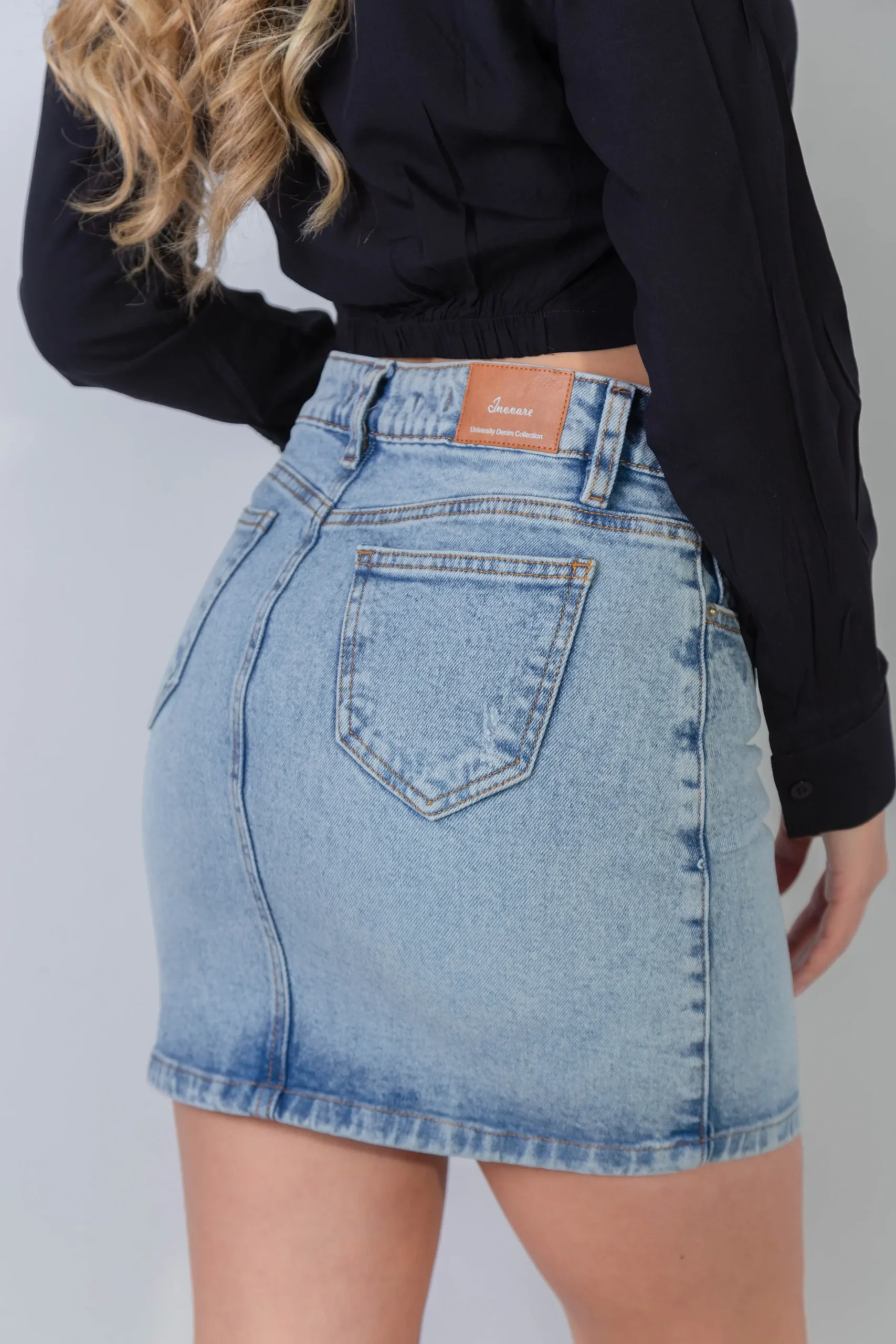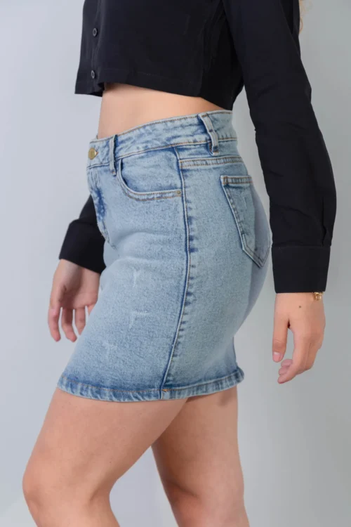 Falda ajustada de tela confort, diseño de tiro alto en tono Azul Claro. Presenta una cintura ajustada y cuenta con cinco bolsillos funcionales. Materiales: 98%algodon 2%elastano La modelo mide 1.67cm y su talla es 8