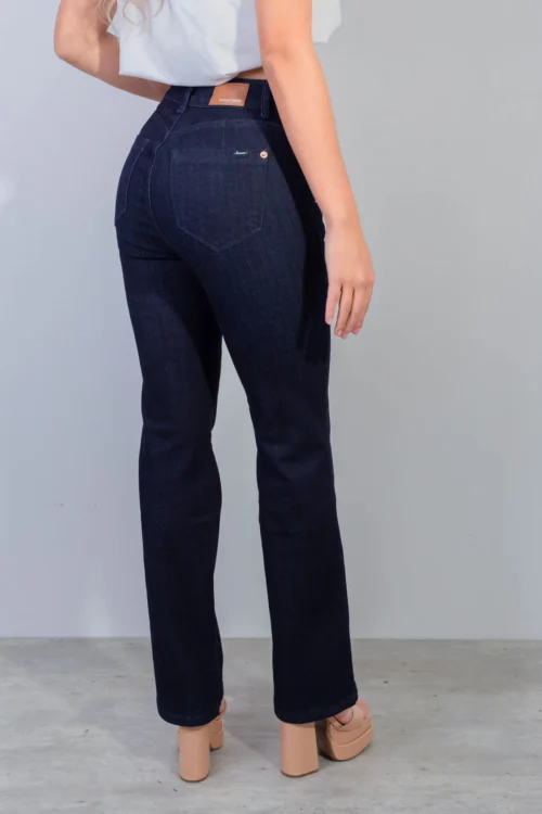 Jean Recto, stretch, tiro alto, tono Azul oscuro , cintura ajustada, pierna recta, diseño cinco bolsillos. Material: 98% algodón 2% elastano. La modelo mide 1.67 cm y su talla es 8